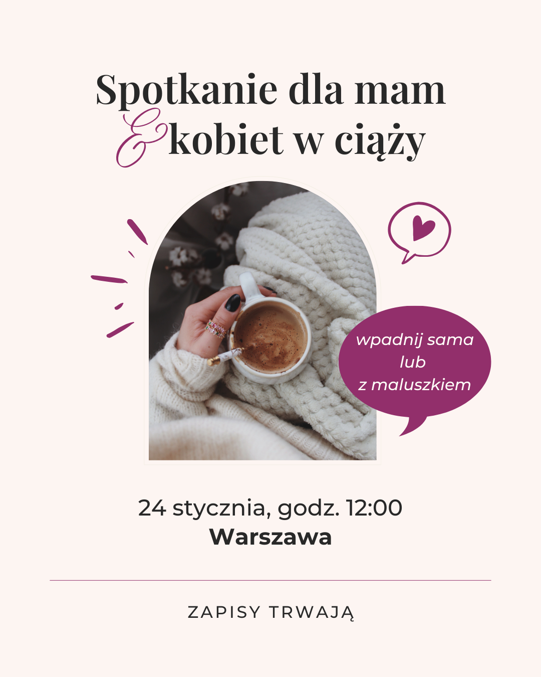 Zapraszam Cię na spotkanie O!Mamo — takie, w którym można przyjść w swetrze, z kawą w dłoni i sercem gotowym na dobrą rozmowę. Bez planu, bez presji. Po prostu… pobyć.